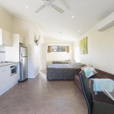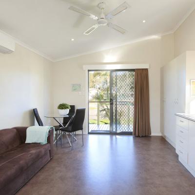 The compact kitchenette allows you to self-cater with fridge/freezer, single cook-top, sink and microwave and dining setting.